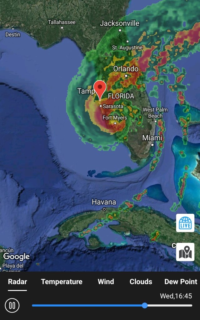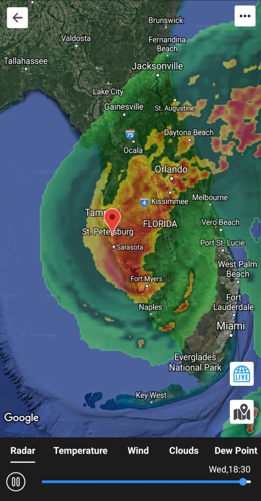 ผ่านเหตุการณ์นั้นมา 5 ปี มาปีนี้ Ian เข้ามาด้วย cat.4 แต่รอบนี้เราอยู่บ้านตัวเองกับแม่และลูกๆที่เหลืออยู่เพียงสอง (กำไล กับ เบบี๋) ที่เมือง Palmetto เตรียมพร้อมทั้งเทียน ไฟฉาย อาหาร แม้ปีนี้ดูเหมือนจะเป็นพายุลูกใหญ่เหมือนกันและดูจากเรด้าก็ไม่ได้ไกลจากบ้านที่เราอยู่เท่าไหร่ (จุดสีแดงคือบ้านเรา) แต่ดูเหมือนฝนที่ตกและลมที่พัดมา แถวๆที่เราอยู่ไม่ได้แรงมากนัก ดูเหมือนมันอาจจะ landfall ไปทาง Fort Myer ซะมากกว่า